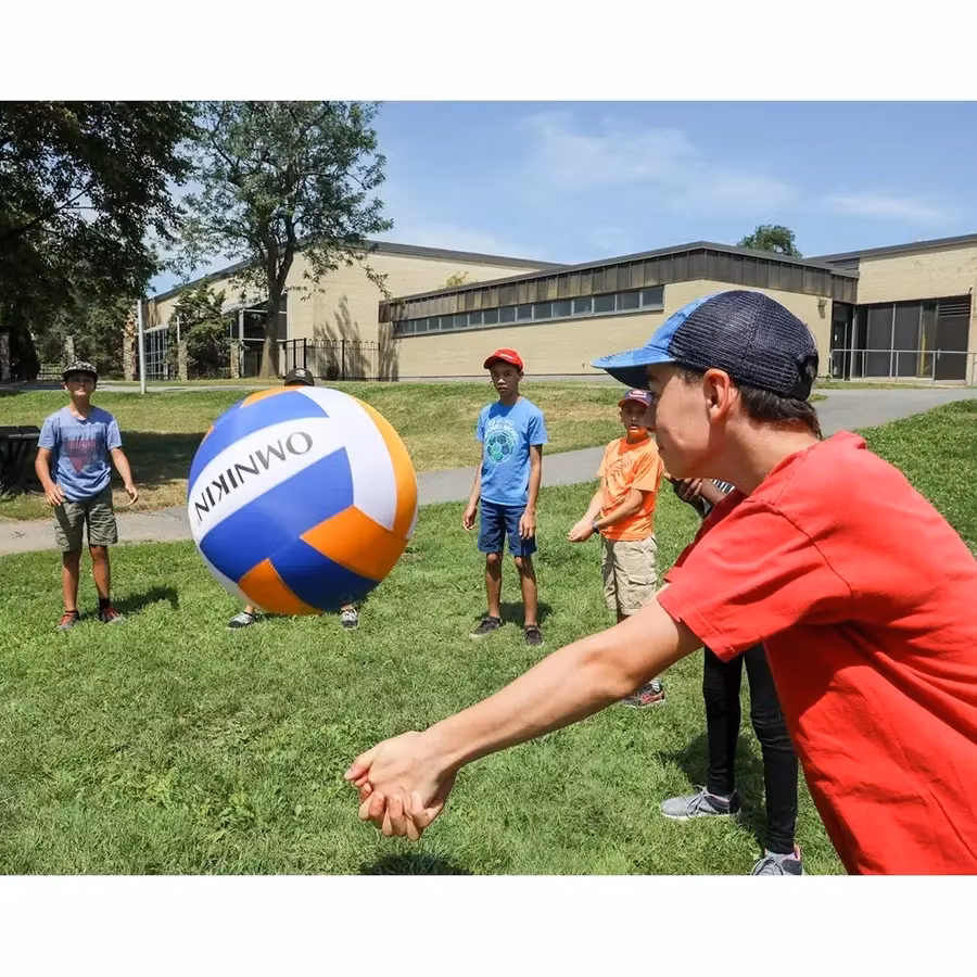 Bollen består av ett ytterhölje i canvas/nylon och en innerblåsa i latex/gummi. ytterhöljet är mycket slitstarkt och håller i många år. innerhöljet byts enkelt ut genom den lilla förslutbara öppningen i ytterhöljet. Bollen pumpas med vanlig bollpump. Bollarna går alldeles utmärkt att använda både inom och utomhus. Tål vatten och fukt. Ytterhöljet går att tvätta i maskin. Ø 32 cm. OMNIKIN® volleyboll är ca dubbelt så stor som en vanlig volleyboll. 3 års garanti på ytterhöljet!
